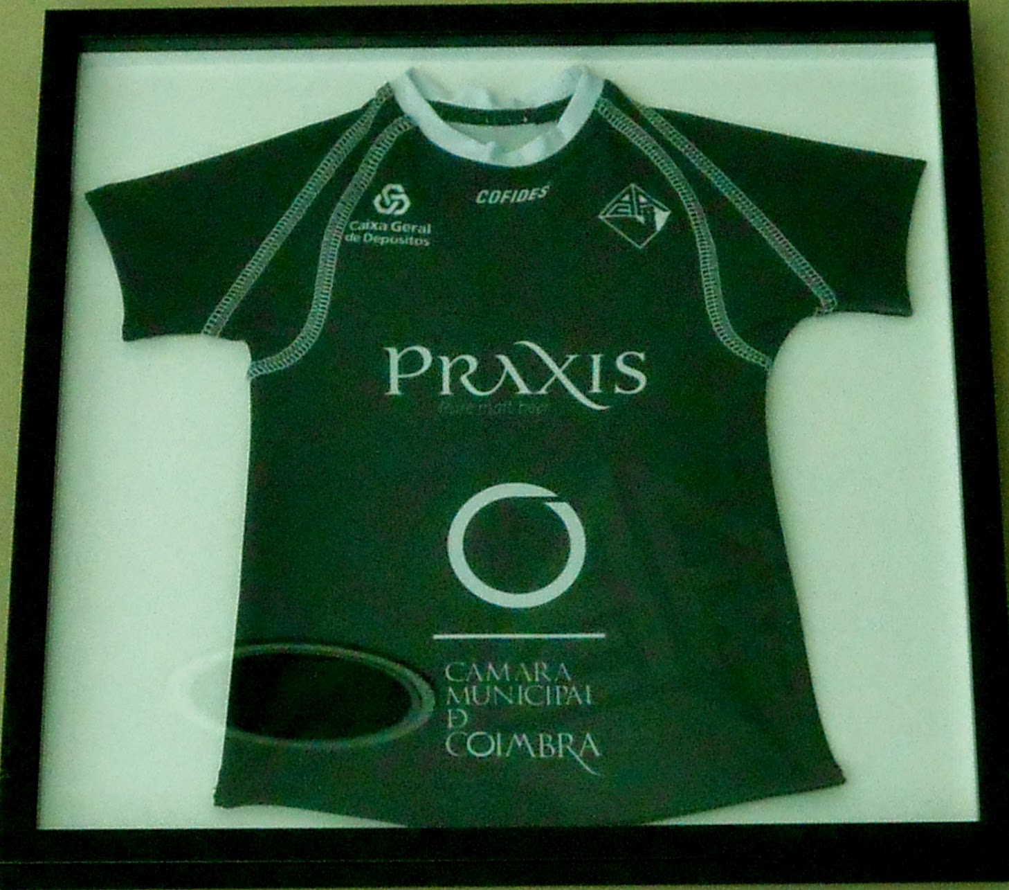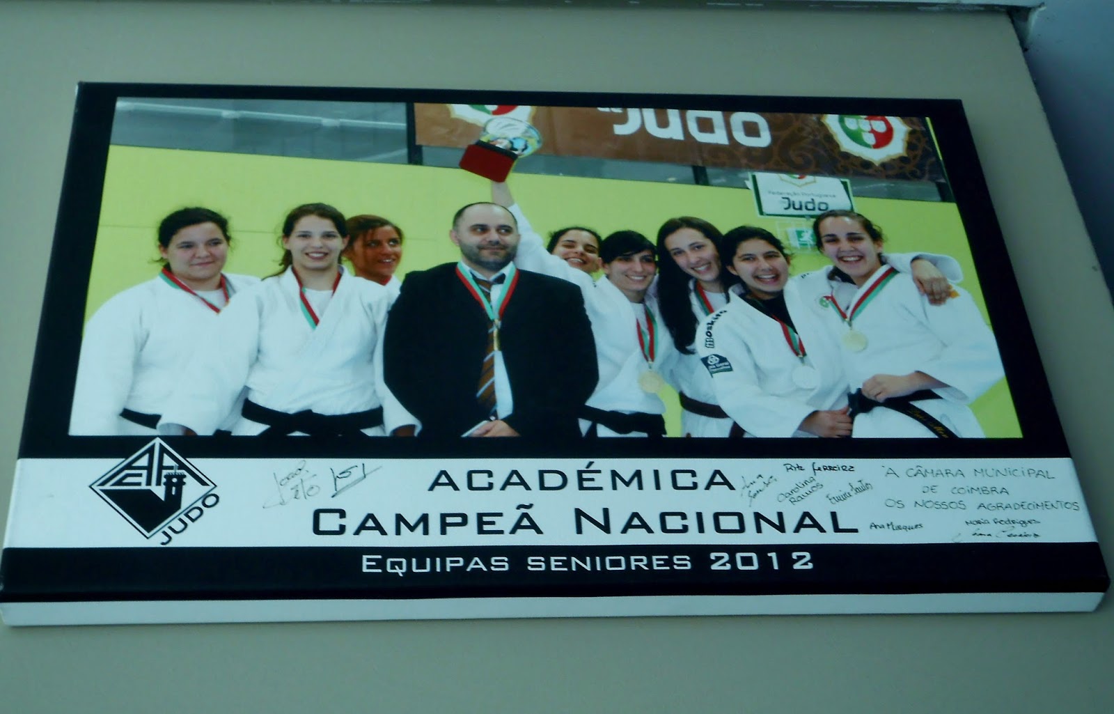 A parte frontal do pedestal ostenta o brasão da cidade de Coimbra em bronze.